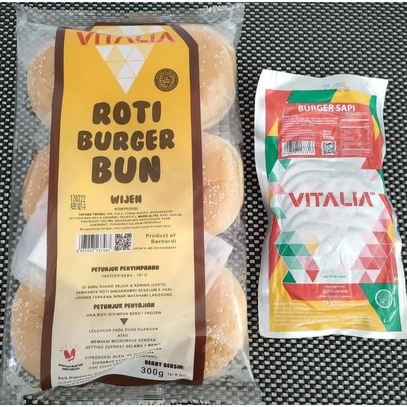 Paket Roti Burger dengan taburan wijen isi 6 berat 300 gr dan Beef Vitalia isi 10 berat 250 gr.