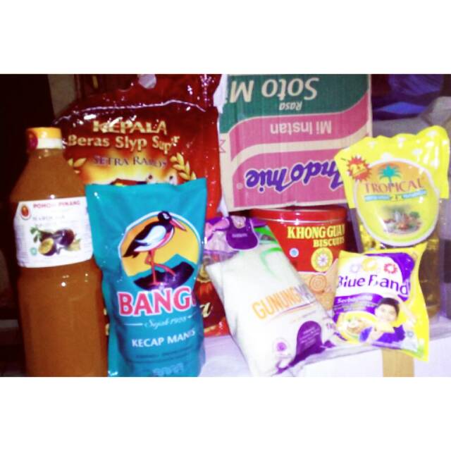 Indomie rasa soto 1 dus isi 48, kecap bango 900ml Beras Slip 5 kg, Minyak goreng tropikal 1000ml, Blue band, syrup Pinang, Gula 1kg