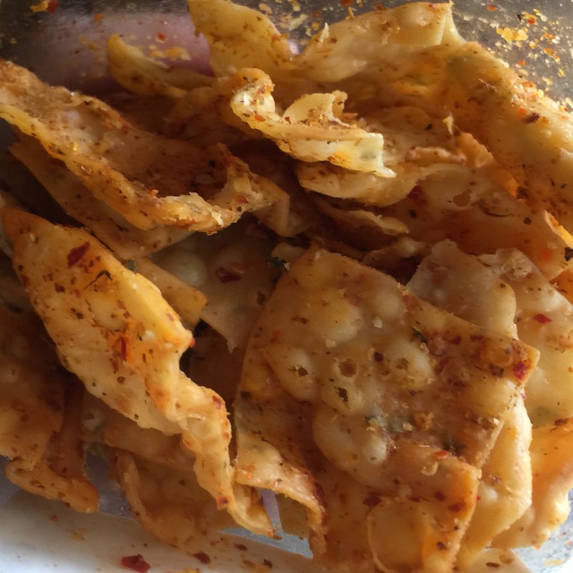 Keripik Kue Bawang / Pangsit dengan Bumbu Pedas Gurih Khas Moonaya Snacks , cocok untuk menemani segala suasana.