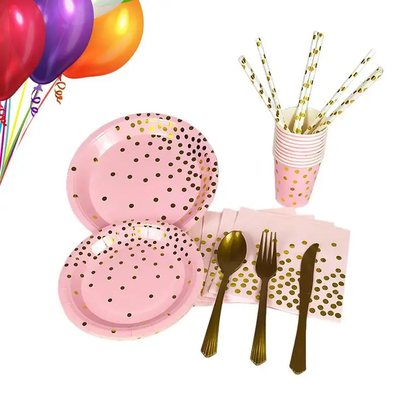 Paper Plate Set Party Reception Tableware Paper Dinnerware Plate Set Portable Paper Plate Set With Gold Foil Polka Dot Pattern