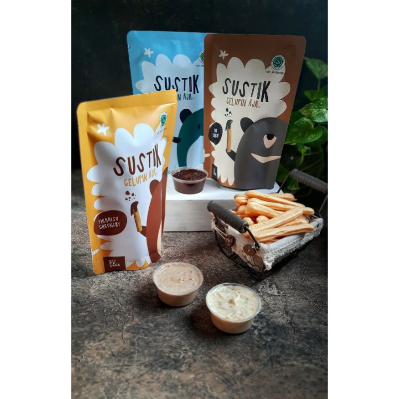 Sustik adalah soes kering keju premium berbentuk stick yang dilengkapi dengan pilihan saus crunchy.