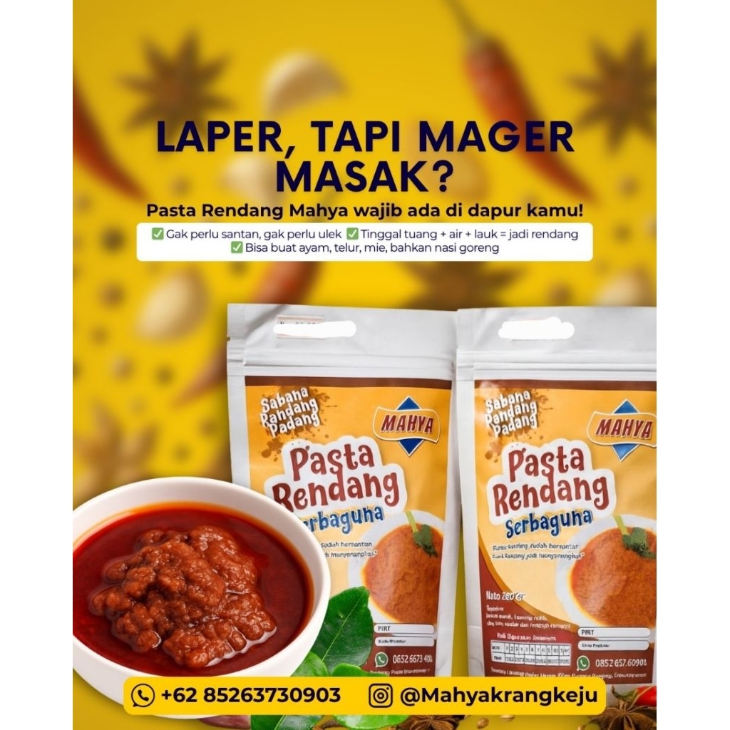 Merupakan bumbu rendang praktis & serbaguna yang sudah dilengkapi dengan santan& daun daun rempah, sehingga menjadikan memasak rendang begitu mudah, simple dan anti ribet, tinggal mencampurkan bumbu pasta rendang dgn air dan lauk yg diinginkan.