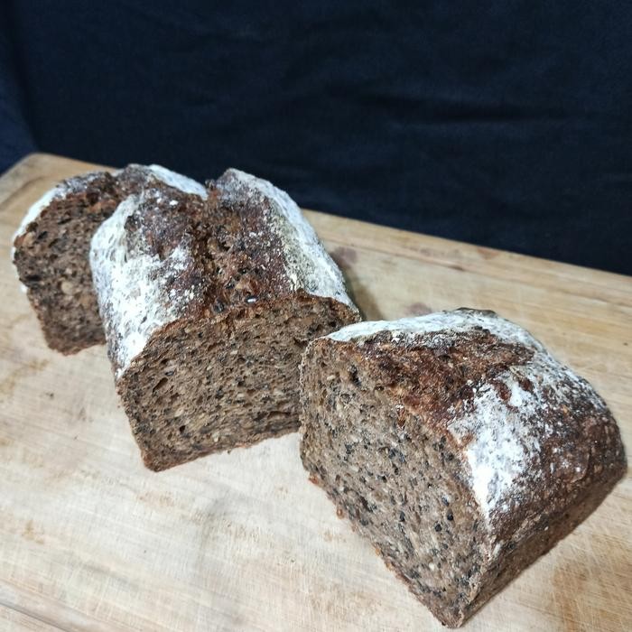 -Tepung rye hitam: Tepung khas dari gandum rye yang memberikan warna gelap dan rasa khas pada roti ini.