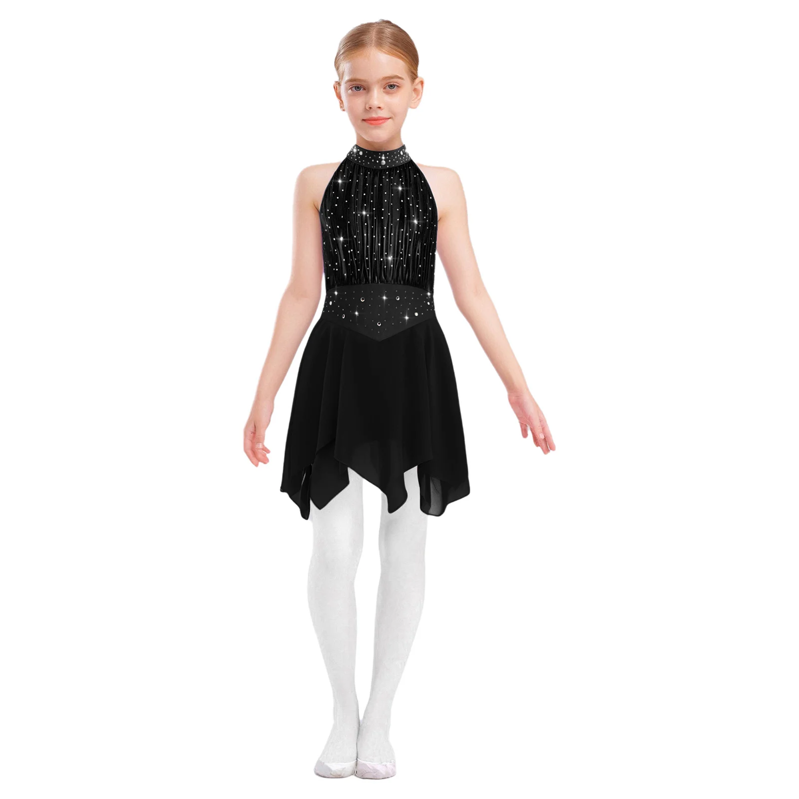 Teen Girls Figure Skating Stage Performance Costume Lyrical Dance Dress Shiny Rhinestones Mesh Bodice Ballet Gymnastics Leotard