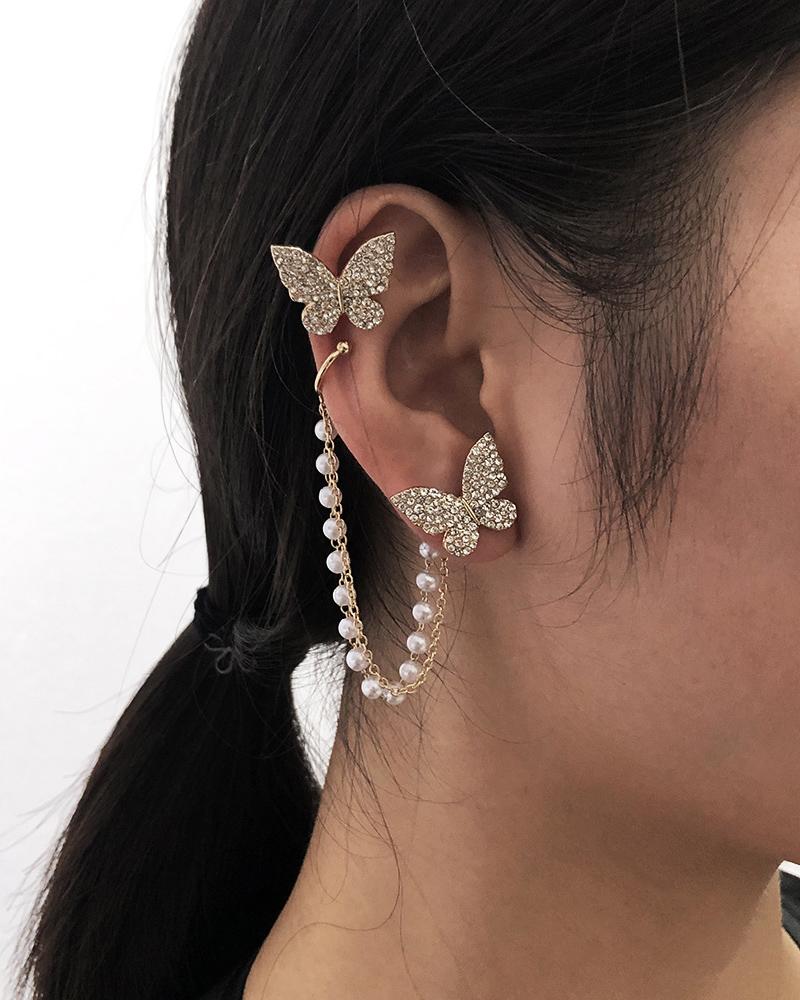Pearls Rhinestone Decor Butterfly Pattern Ear Climber, Gold