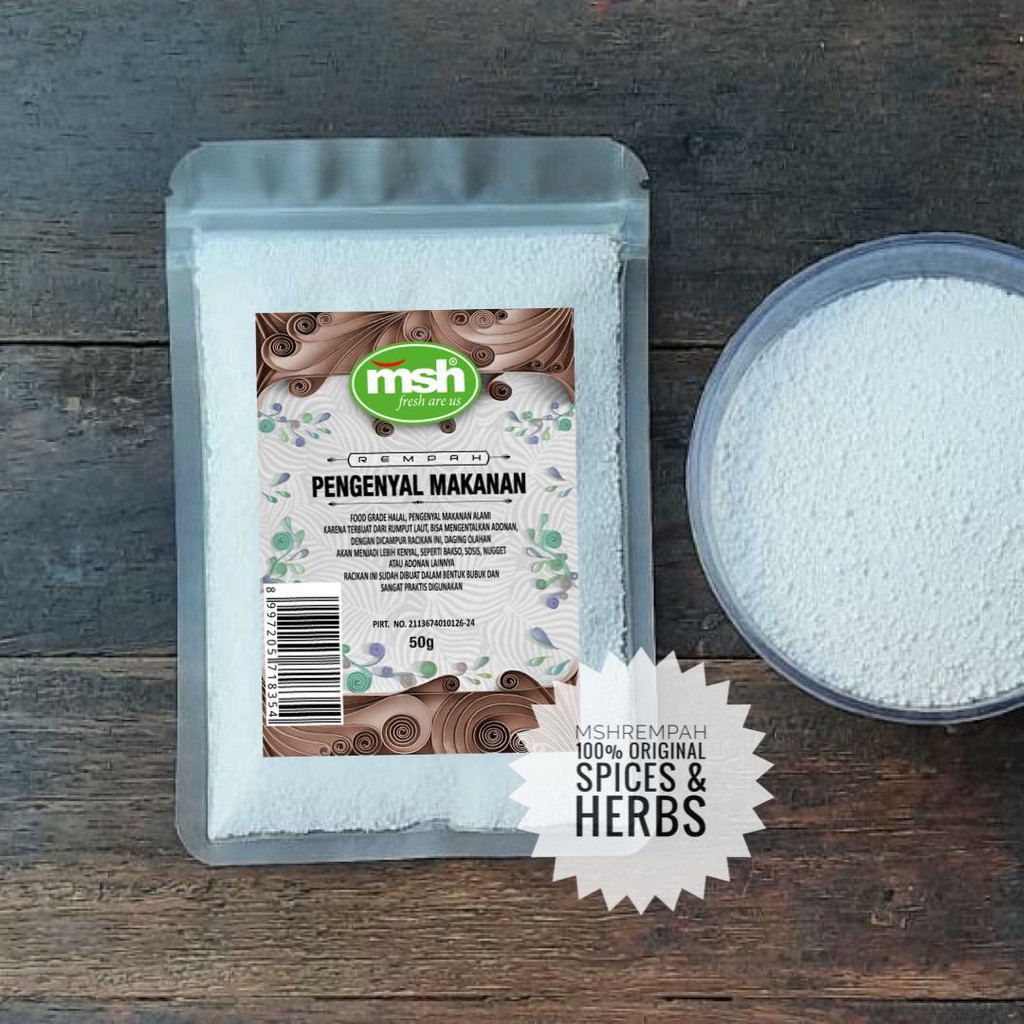 Pengenyal makanan alami karena terbuat dari rumput laut, bisa mengentalkan adonan, dengan dicampur racikan ini, daging olahan akan menjadi lebih kenyal. Dipakai untuk makanan seperti bakso, sosis, nugget atau adonan lainnya.