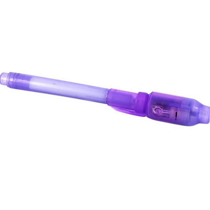 Pen dengan tinta invisible. Bagian tutupnya terdapat senter cahaya ultra violet yang berfungsi untuk melihat hasil tulisannya. Tanpa sinar tsb, tulisan tidak akan terlihat. Dapat ditulis semua bidang seperti kertas, plastik, lantai, di kulit ,dll. Tulisan akan sangat jelas terlihat jika terkena cahaya senter ultra violetnya bahkan di siang hari. Dengan Pen ini Anda dapat menuliskan pesan rahasia tanpa terlihat.