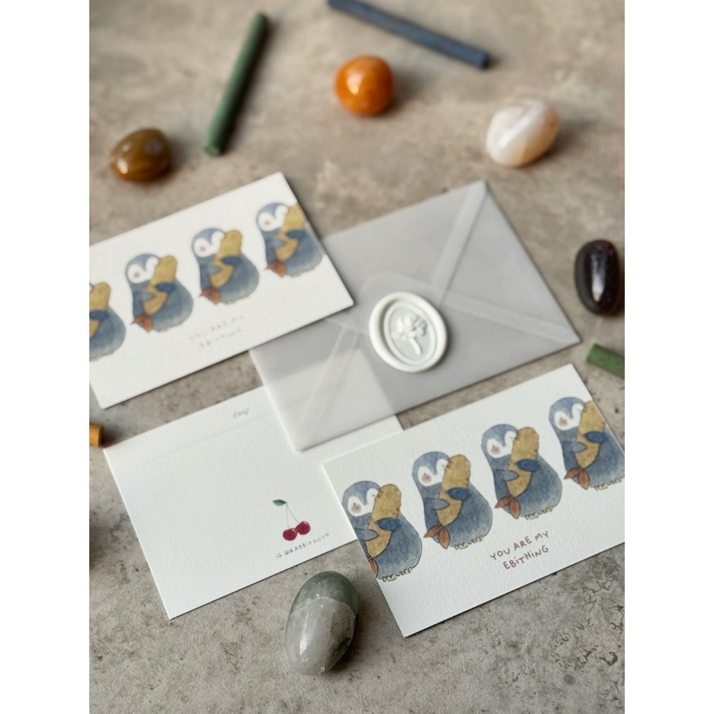 Comes in A7 size, the postcard is a set with translucent envelope.