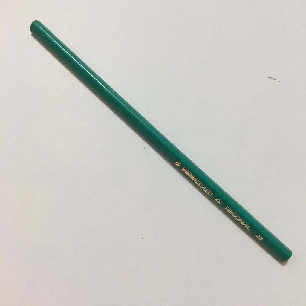 Pensil segitiga dengan body berwarna hijau. Grade 2B, cocok untuk ujian nasional menggunakan komputer. UAN, Ujian saringan masuk universitas.