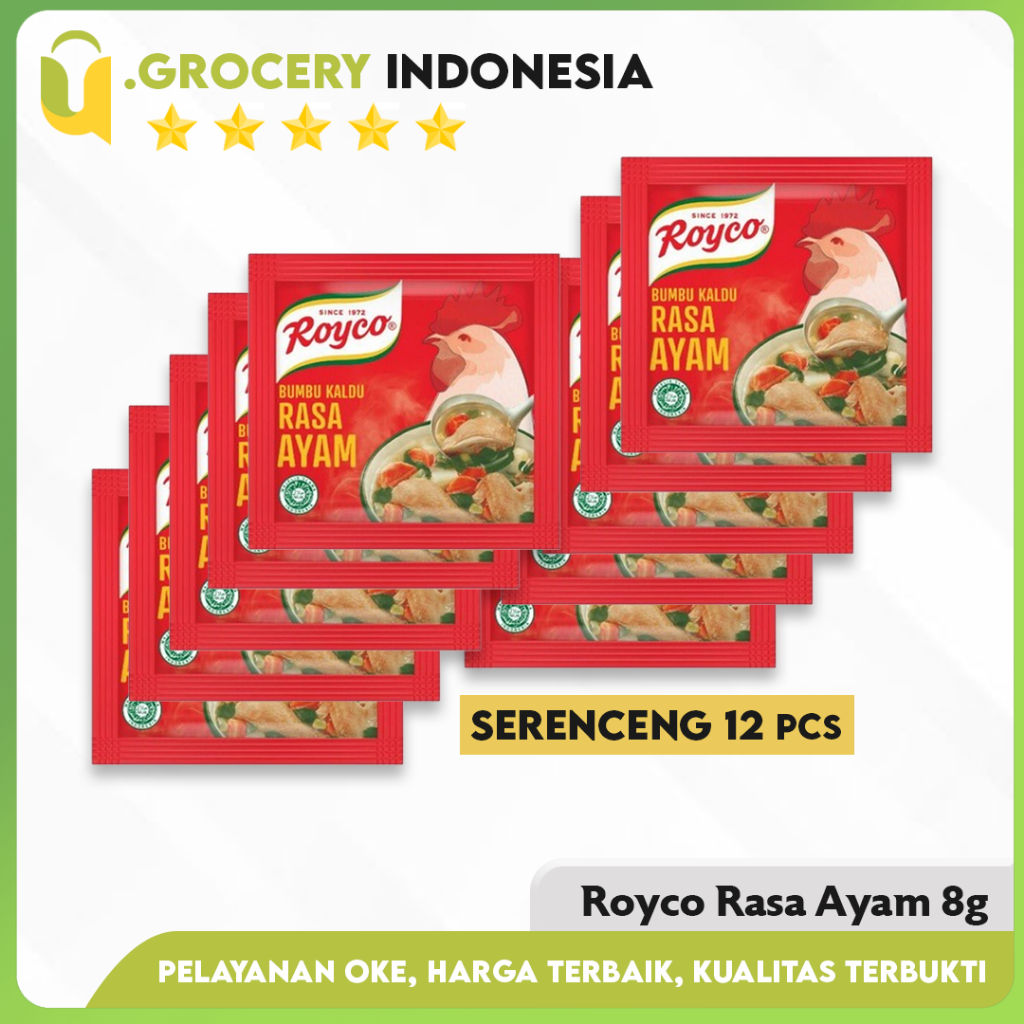 Note : + Chat terlebih dahulu untuk Cek stock sebelum order + Jangan lupa masukan keranjang / wishlist supaya produk tidak hilang dari pencarian kamu + Jika ada yang ingin ditanyakan, bisa langsung klik tombol pesan Nama Produ :Royco Ayam Berat Produk :8g/sachet Penyedap Royco Ayam Renceng isi 12 Pcs Merupakan bumbu penyedap khas Indonesia yang terbuat dari rempah-rempah alami khas Indonesia untuk menghasilkan masakan dengan citarasa gurih yang mantap dengan cepat. Terima kasih Selamat berbelanja di u.grocery indonesia >.
