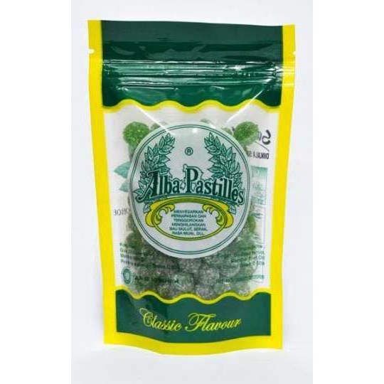 Permen Alba Pastilles Classic Flavour..berguna untuk menyegarkan pernafasan dan tenggorokan..menghilangkan bau mulut, serak dan rasa mual..1 plastik isi 10 pak..berat netto 100 gram..berat pengiriman 110 gram/buah