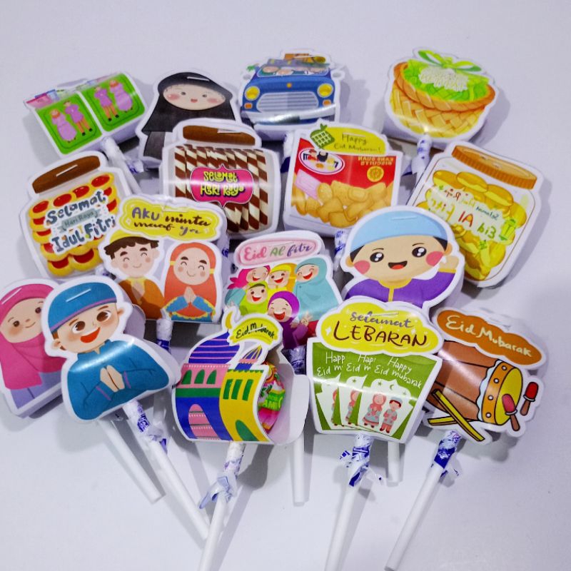 Permen lolipop lebaran , permen lolipop yang dikemas tema Idul Fitri. Kemasan menggunakan bahan art paper 260g tanpa membuka kemasan aslinya.
