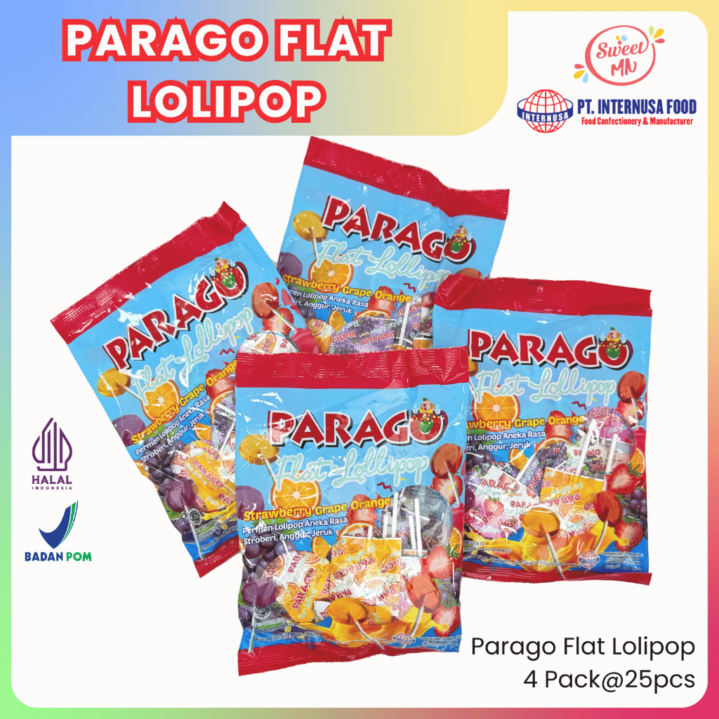 Nikmati permen lolipop pipih dengan rasa buah yang menyegarkan dari Parago. Hadir dalam varian rasa strawberry, anggur, dan jeruk, permen ini cocok sebagai camilan ringan, isian goodie bag, atau dijual eceran di toko dan warung.