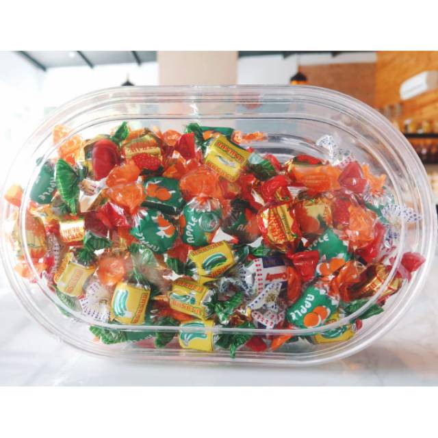 Satu toples bermacam rasa pisang, leci, strawberry, apel, nanas