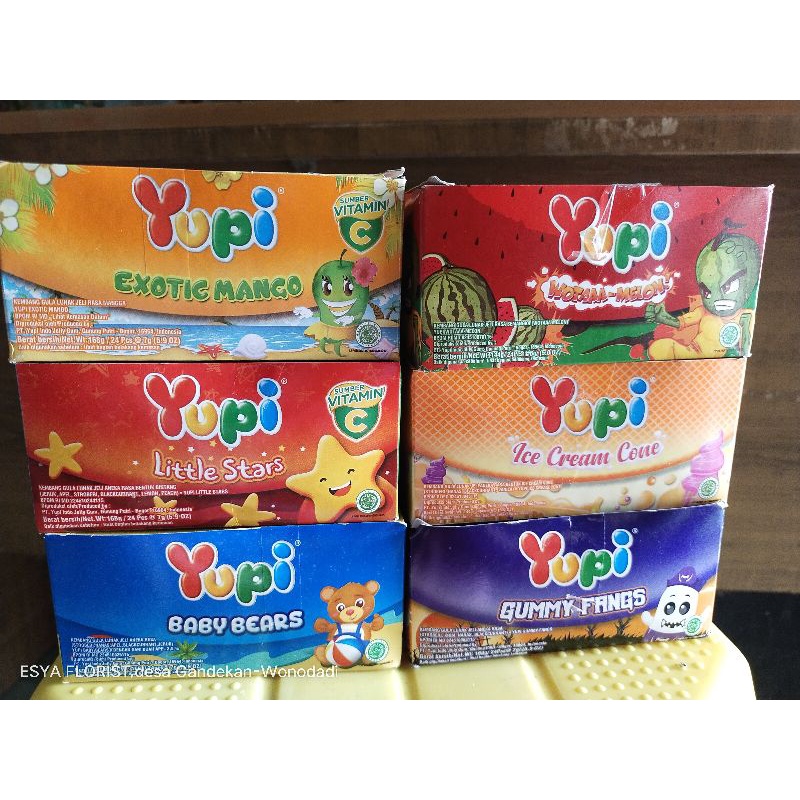 Permen yupi 500,hadir dg berbagai macam karakter yg di sukai anak anak,berisi 24 pcs