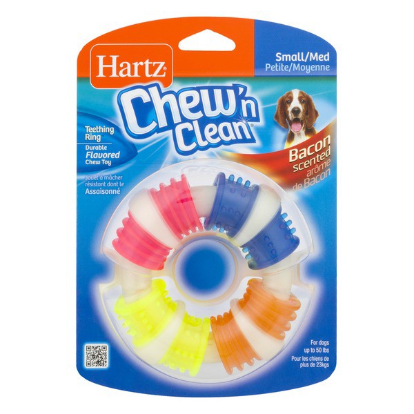 Hartz Chew N Clean Teething RingDescription :Combines dental cleaning and fun!The bacon scent keeps dogs interested while the raised tips massage gums and help remove tartar.Excellent for puppies and tough chewers.Deskripsi :Kombinasikan membersihkan gigi dan kegembiraan!Aroma daging terus membuat anjing tertarik sementara ujung yang terangkat memijat gusi dan membantu menghilangkan tartar.Sangat baik untuk anak anjing dan pengunyah yang kuat.