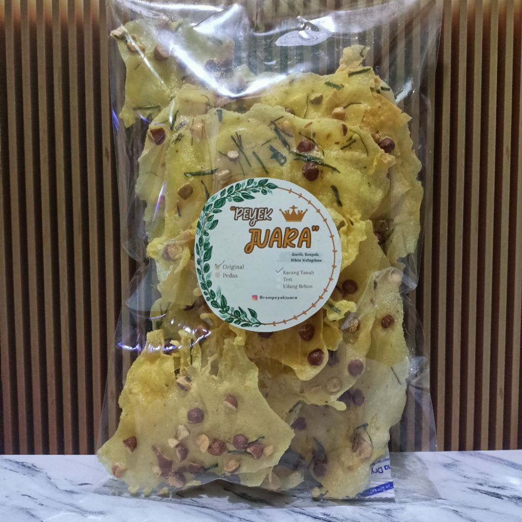 rempeyek home made, renyah, gurih dengan toping kacang.. Berat kurang lebih 100 gr.. kemasan plastik mika 05 uk 18 x 35 cm