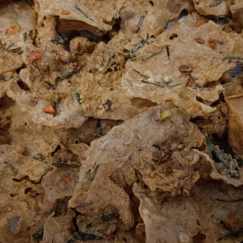 peyek yg digoreng dengan udang rebon yg menghasilkan rasa gurih renyah ditambah potongan cabe yang menggugah selera.