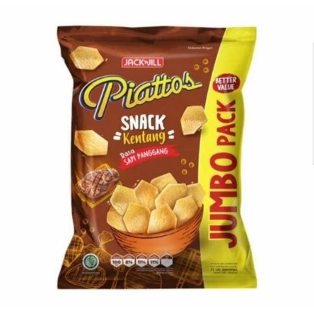 Piattos adalah keripik kentang berbentuk segi enam yang unik dengan tekstur yang tebal dan rasa sapi panggang yang istimewa. Piattos dihasilkan dari kentang pilihan dan bumbu lezat yang akan menjadi kesukaanmu. Rasakan kerenyahan dalam setiap gigitan