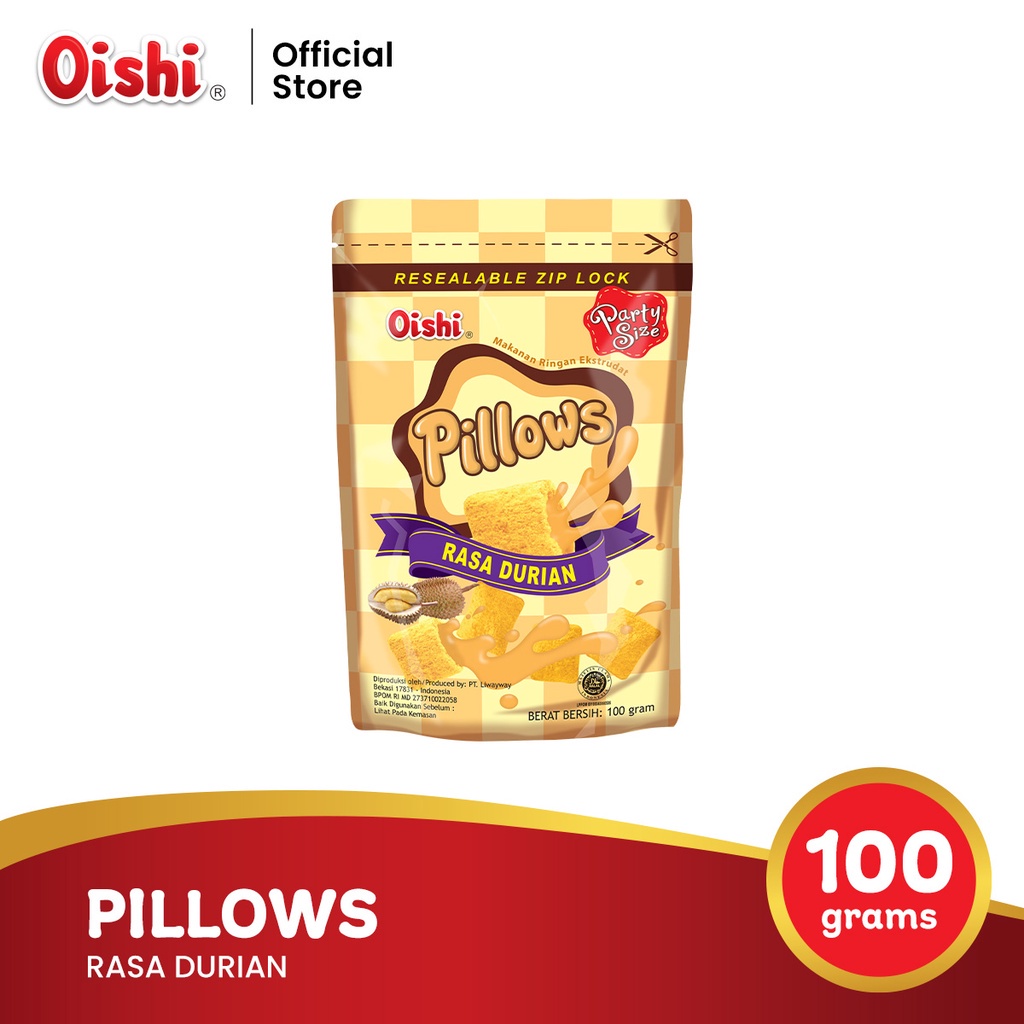 OISHI PILLOWS MAKANAN RINGAN EKSTRUDAT RASA DURIAN (DURIAN FLAVOR) 100g