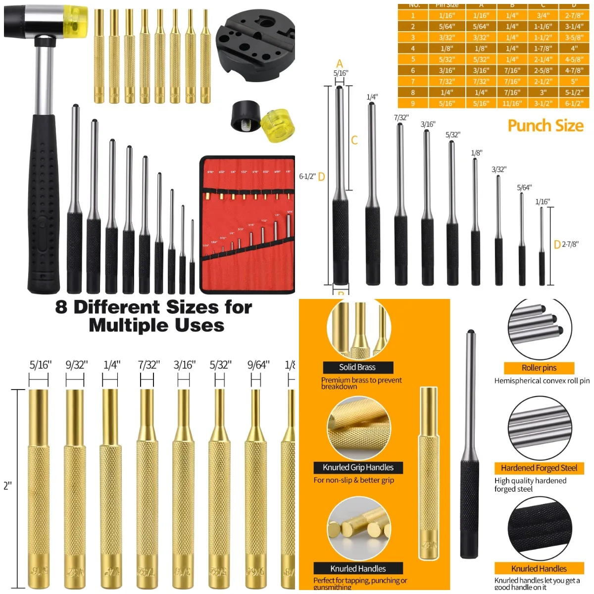 Pin Punch Set, 22pcs Removing Repair Tools, Including Universal Block, Brass Pin Punches, Steel Pin Punches and Hammer