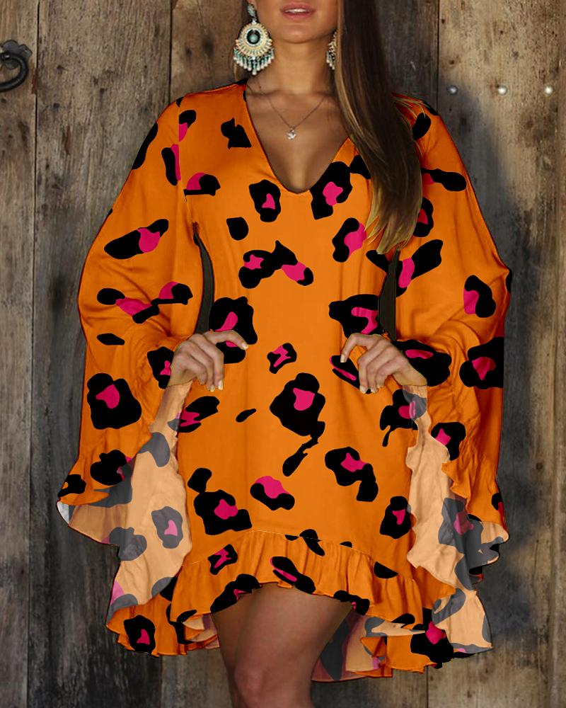 Pink Leopard Print Ruffles Bell Sleeve Casual Dress, Orange