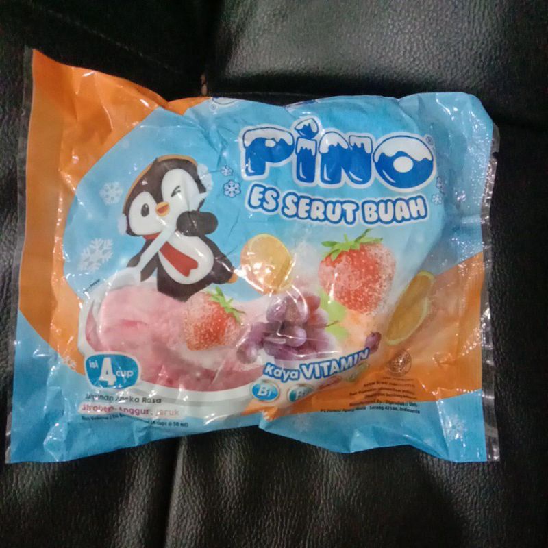 Pino ice cup rasa buah. Dijual per pak isi 4cup sudah campur 3rasa yaitu jeruk, anggur dan stroberi.