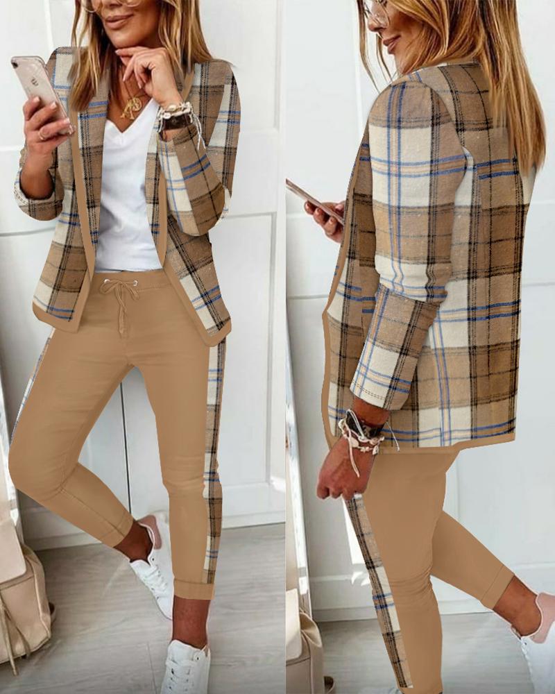 Plaid Pattern Shawl Collar Blazer Coat & Drawstring Pants Set, Brown