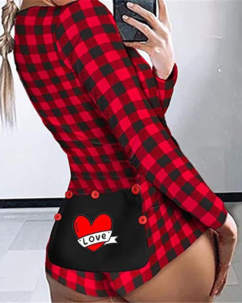 Plaid Print Long Sleeve Functional Button Design Romper, Red
