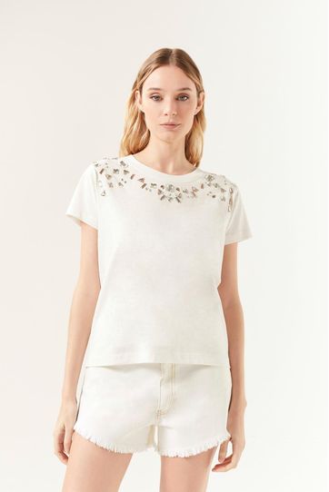 Playera de algodón de calce relajado mangas cortas y cuello redondo. Con piezas tipo piedras de colores bordadas. Para que armes un look descontracturado con un toque cool y original.