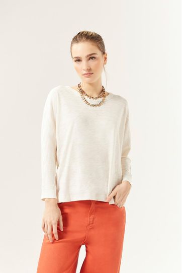 Playera básica confeccionada en algodón de textura jaspeada. De cuello redondo, manga ¾ y moldería suelta, es un básico infaltable que siempre sienta bien, perfecto para completar cualquier look.