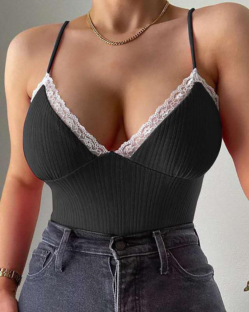 Plunge Crochet Lace Ribbed Cami Top, Black