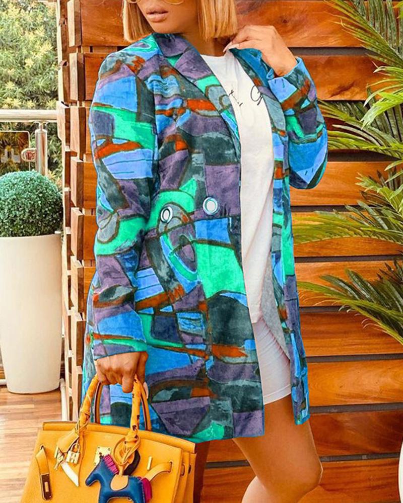 Plus Size Abstract Print Grommet Eyelet Decor Coat, Blue