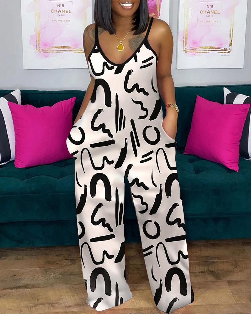 Plus Size Abstract Print Spaghetti Strap Jumpsuit, Apricot