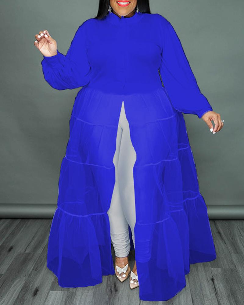 Plus Size Button Front Contrast Mesh Shirt Dress, Blue