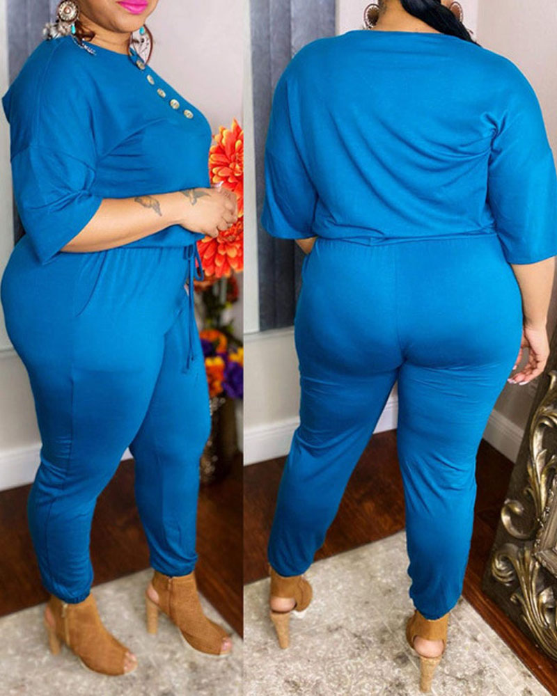 Plus Size Button Front Drawstring Waist Jumpsuit, Blue