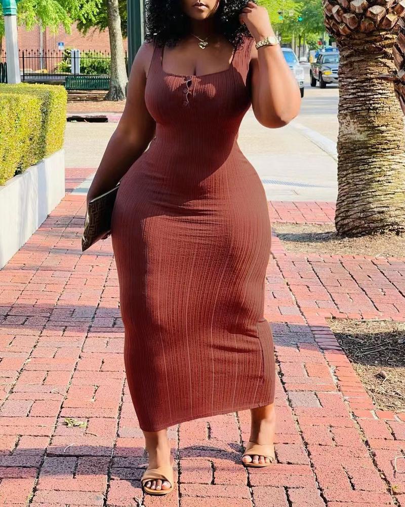 Plus Size Button Front U-Neck Ribbed Tank Dress, Coffee