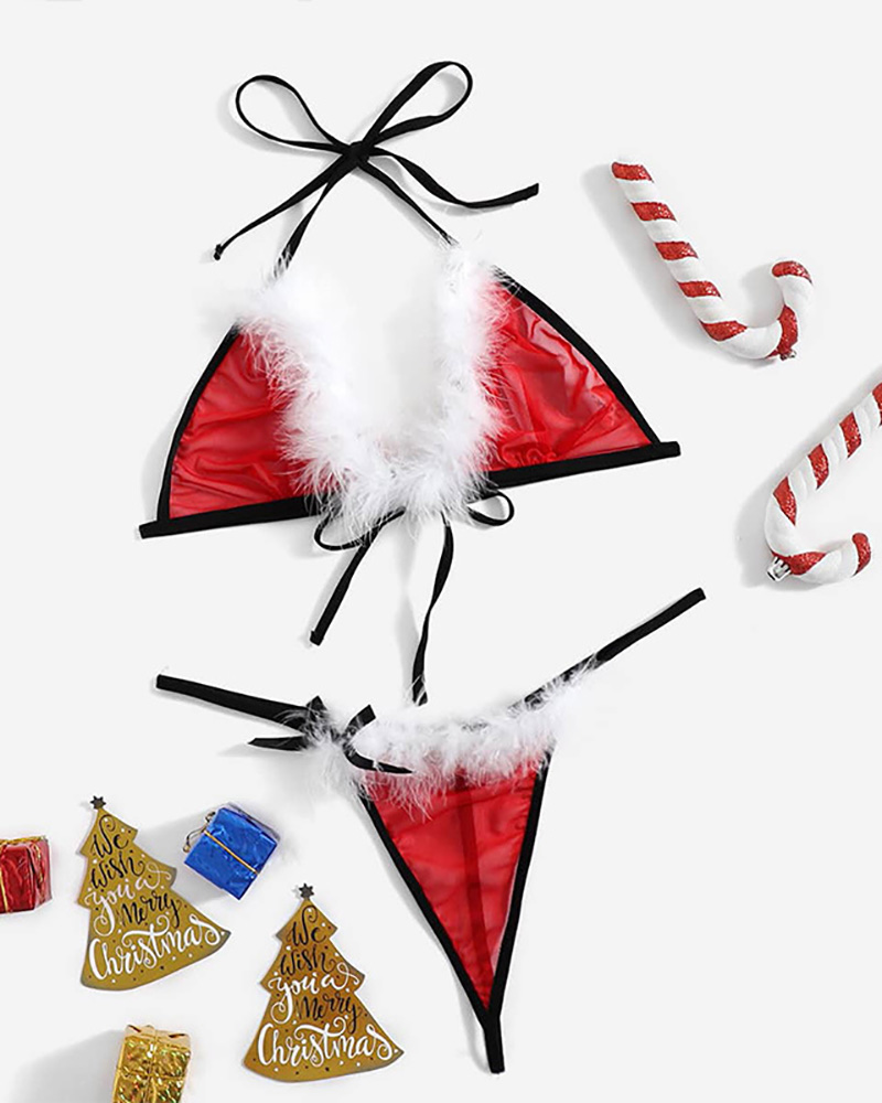 Plus Size Christmas Sheer Mesh Fuzzy Collar Tied Detail Lingerie Set, Red