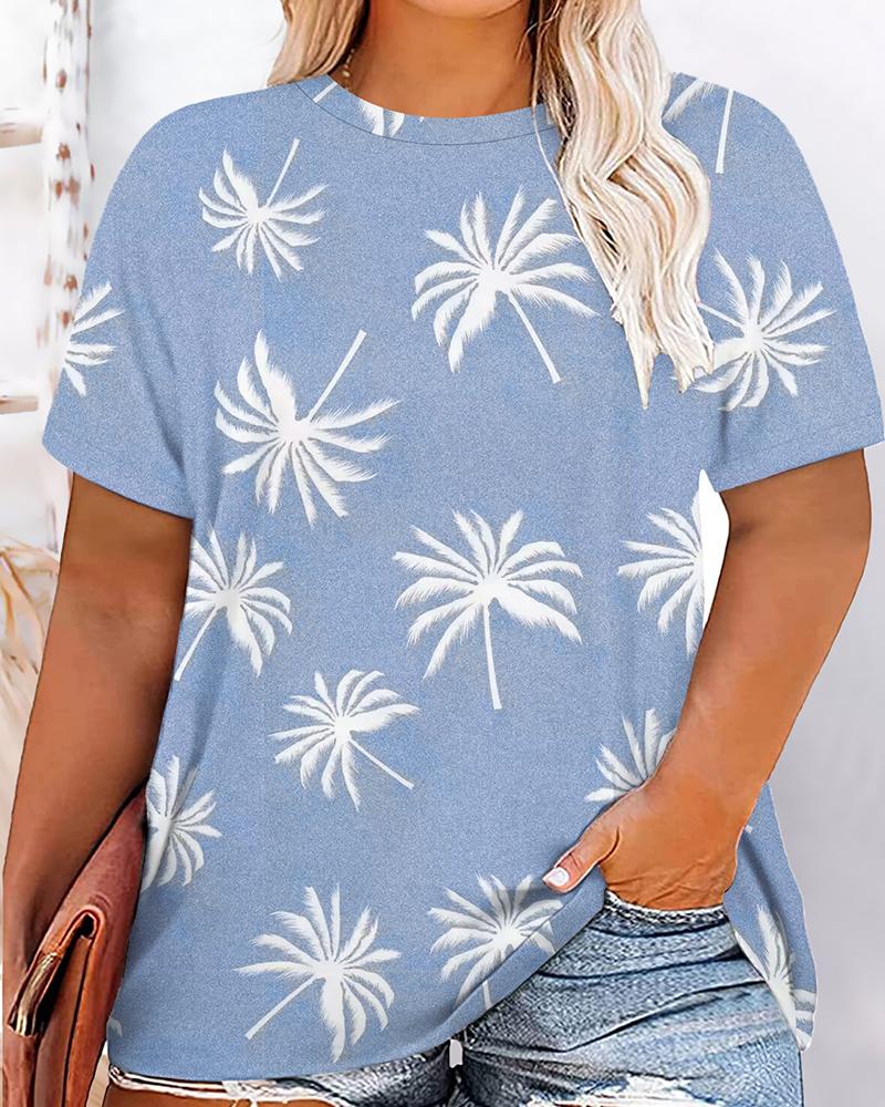 Plus Size Coconut Tree Print Round Neck T-Shirt, Blue