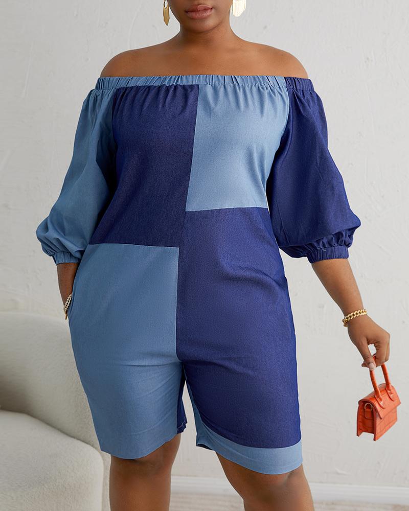 Plus Size Colorblock Off Shoulder Romper, Blue
