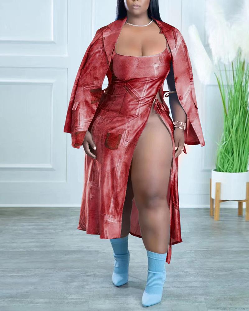 Plus Size Denim Look Print High Slit Dress & Blazer Set, Wine red