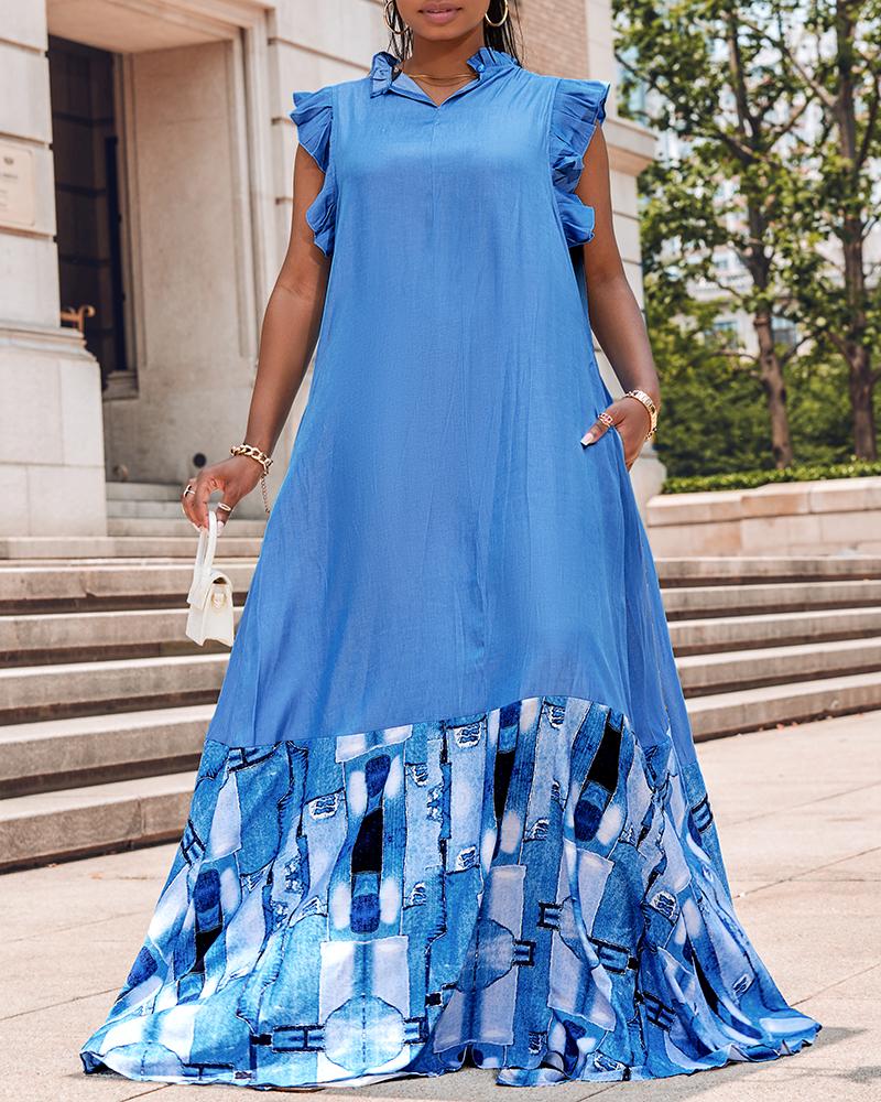 Plus Size Denim Look Print Patchwork Ruffle Hem Maxi Dress, Blue