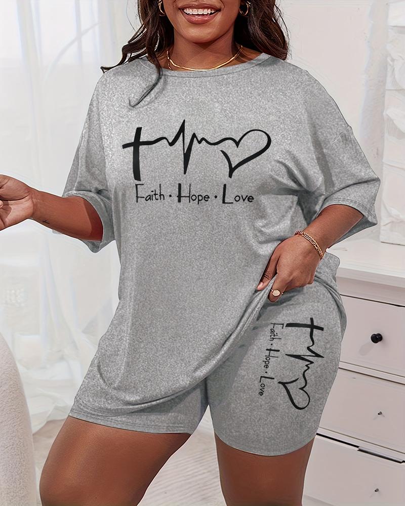 Plus Size Heart Faith Hope Love Print Pajamas Set, Gray