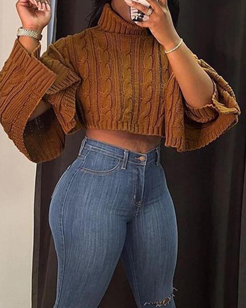 Plus Size High Low Hem Turtleneck Cable Knit Sweater, Coffee