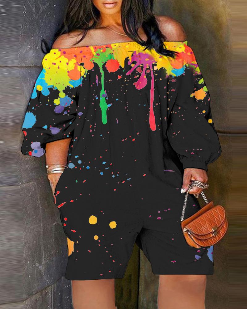 Plus Size Ink Splash Print Off Shoulder Romper, Black