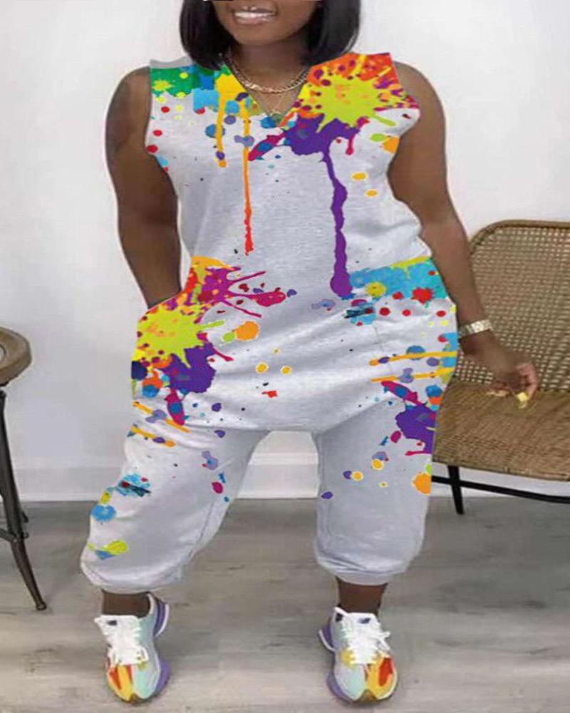 Plus Size Ink Splash Print Sleeveless Jumpsuit, Gray