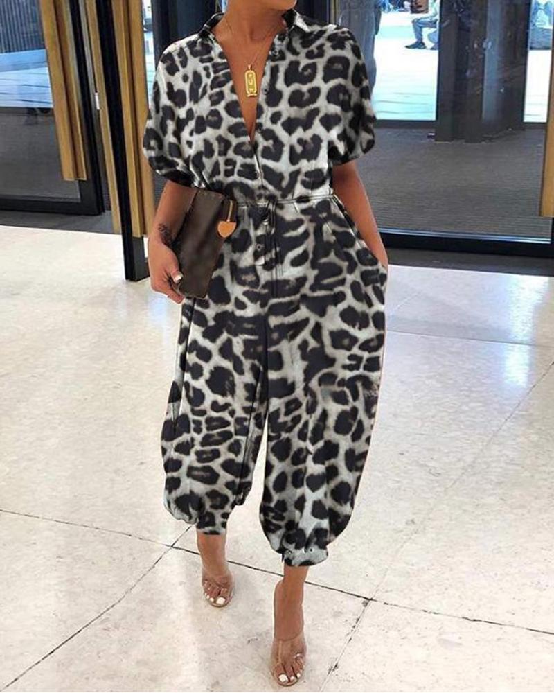 Plus Size Leopard Print Button Front Jumpsuit, Black