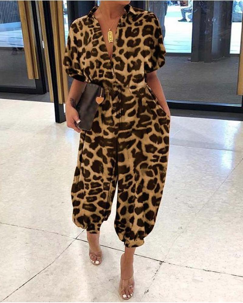 Plus Size Leopard Print Button Front Jumpsuit, Coffee