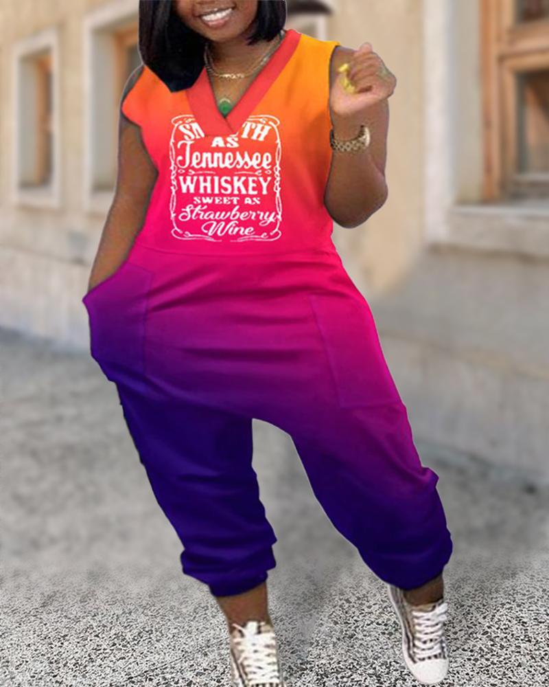 Plus Size Letter Print Ombre Pocket Design Jumpsuit, Multicolor
