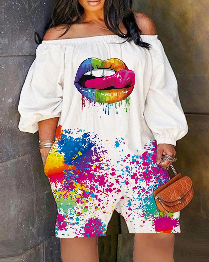 Plus Size Lip Ink Splash Print Off Shoulder Romper, White